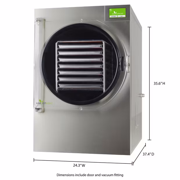 Detta är en frystork från Harvest Right XL Professional. Professional serien är mer kraftfulla och har ett bättre interface och annan programvara än de ”vanliga” Harvest Right ”Home”. OBS! Displayerna på maskinerna på bilderna ovan visar den billigare ”home” programvaran. PRO displayen är röd/rosa istället för grön och har mer inställningsmöjligheter.