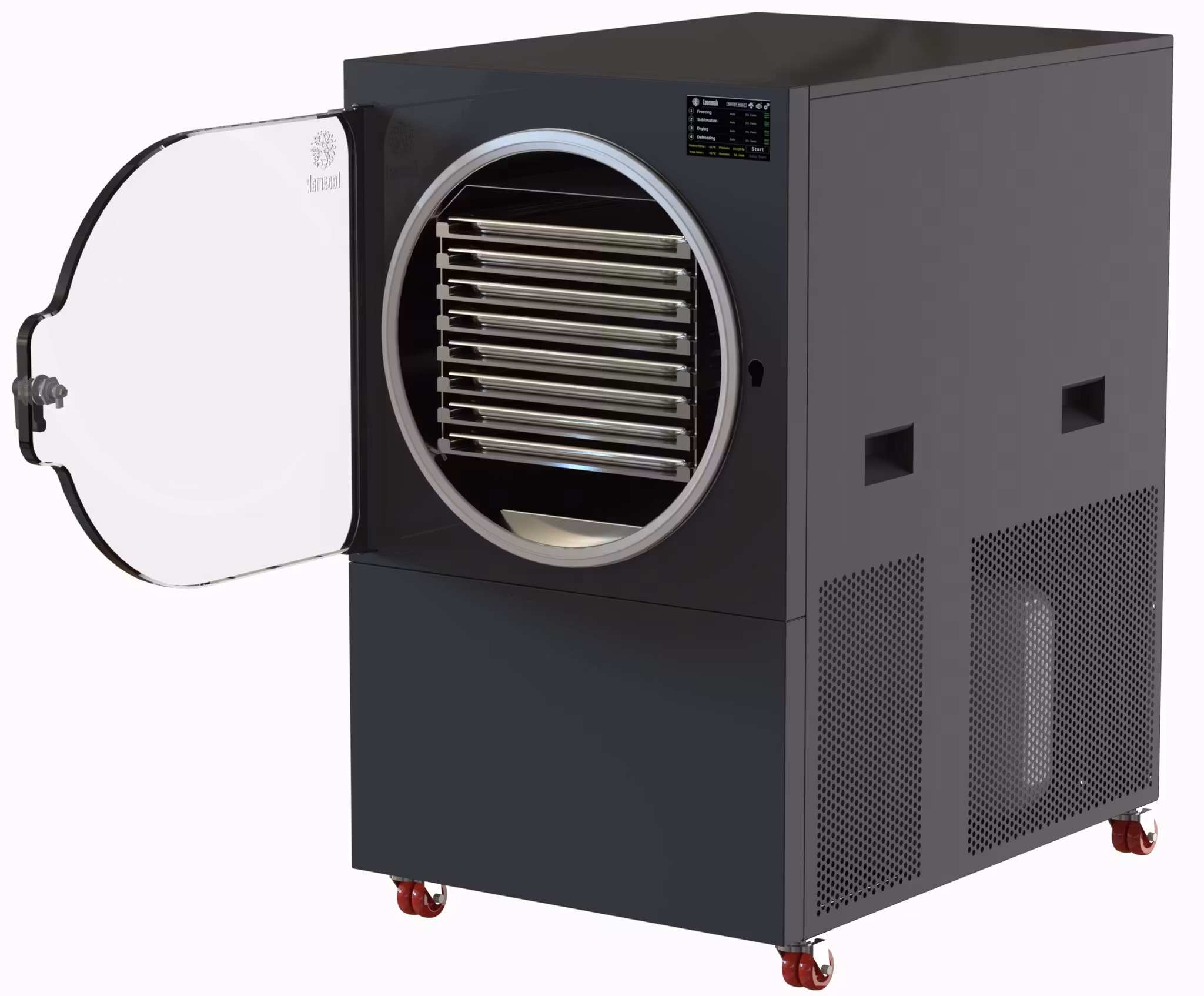 Kapacitet: upp till 40L/batch beroende på vad som frystorkas.