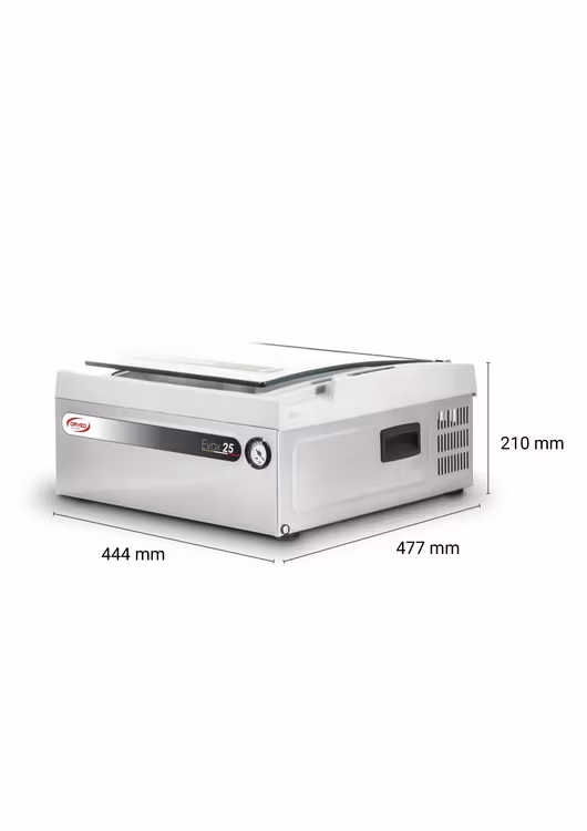 En väldigt snabb vakuummaskin med dom bästa funktionerna på marknaden. Du kan vacca upp till 3 påsar (beroende på tjocklek) samtidigt på varandra utan att dom klibbar ihop. Evox 25 är den enda maskinen i sin prisklass som kan vacca rena vätskor, detta tack vare att du kan köra rengörings programmet som förångar vätskan som kommer in i pumpen efteråt. OBS! Om man vaccar vätska så bör vätskan vara kall och man måste köra rengöringsprogrammet efteråt. Detta eftersom det alltid sugs in vätska i pumpen. Vätskan får inte innehålla mer än 8% av följande salt, socker, syra/vinäger, kryddor. Vätskan får inte innehålla gelatin, agar agar eller liknande.