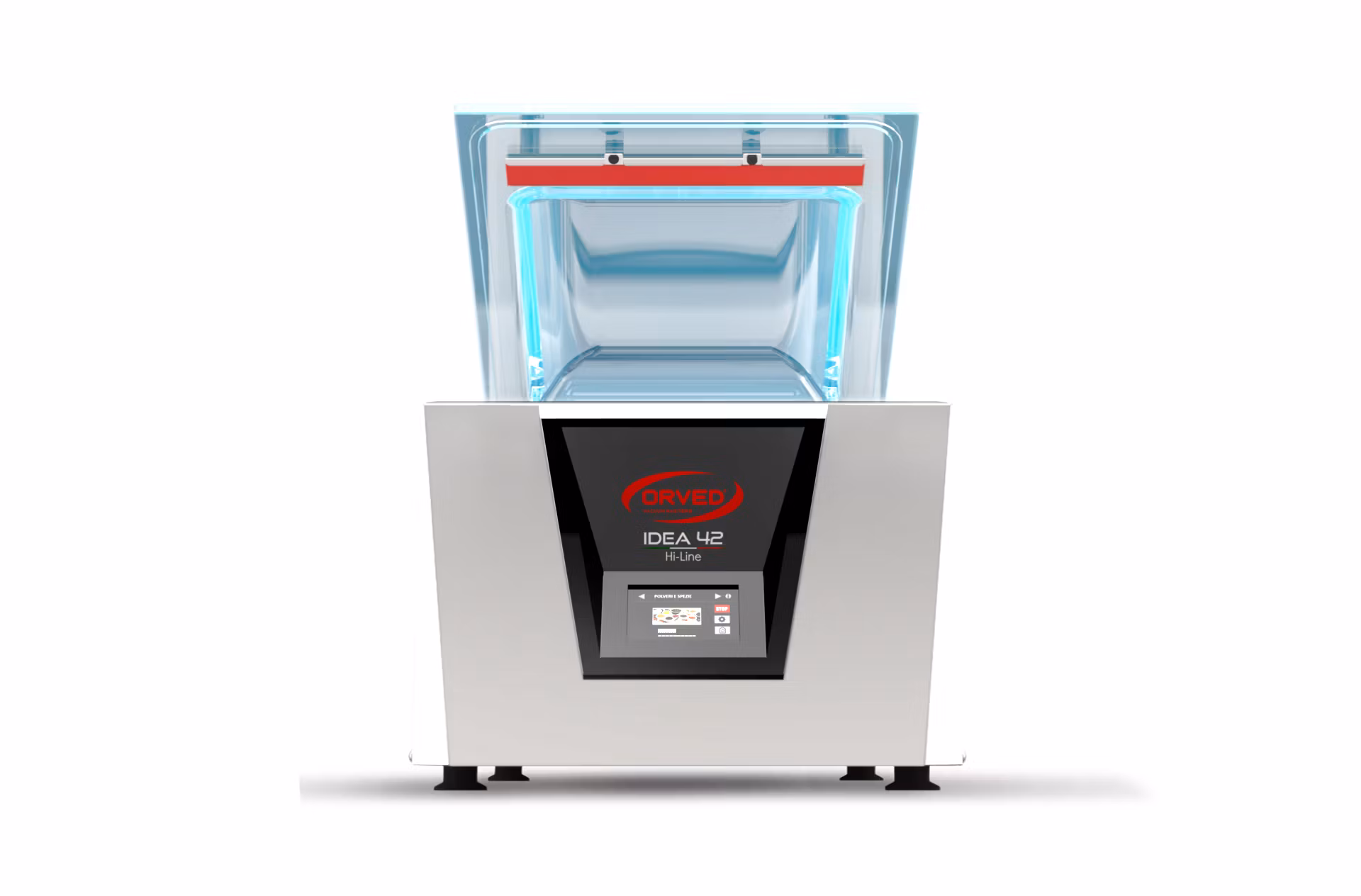 Idea 42 är en väldigt snabb vakuummaskin som är utrustad med en av världens bästa vakuumpumpar från Busch. Idea 42 är utrustad med dom bästa funktionerna på marknaden. Idea 42 är den enda maskinen i sin prisklass som är speciellt framtagen för att vacca vätskor med. Idea 42 har sensorstyrd ”liquid controll” som standard vilket gör att den drar ut 99,9% av syret istället för 90% som en vanlig maskin gör på vätskor. Den är utrustad med tömningsfunktion av pumpen, vilket gör att man har eliminerat de flesta problem som kan uppstå när man vaccar flytande och varma livsmedel. Du kan vakuumförpacka väldigt stora födoämnen tack vare att påsarna även kan vakuumpackas utanför kammaren. Det är enkelt att byta svetsband & lister m,m. Extremt lätt att hålla den ren tack vare den strömlinjeformade designen. Den sensorstyrda vakuummaskinen Idea 42 är kompakt, ergonomisk och utrustad med ett sensoriskt vakuumtryck. Sensoriskt vakuumtryck finns bara i dyra maskiner i vanliga fall och innebär att du ställer in trycket när den ska stanna istället för tid. Detta sparar på motorn/pumpen samt gör att det går snabbare och du får alltid ett bra resultat. Idea 42 är utrustad med en 20m3/h vakuumpump som gör den extremt snabb i jämförelse med liknande maskiner på marknaden. Det starka svetsbandet gör att du kan Vacca upp till 5 påsar samtidigt!