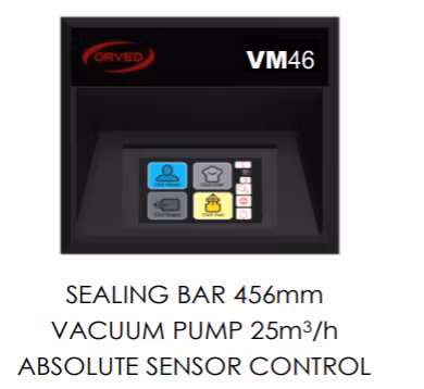 VM46 är en väldigt snabb vakuummaskin som är utrustad med en av världens bästa vakuumpumpar från Busch.VM46 är utrustad med dom bästa funktionerna på marknaden. VM46 är den enda maskinen i sin prisklass som är speciellt framtagen för att vacca vätskor med. VM46 har sensorstyrd ”liquid controll” som standard vilket gör att den drar ut 99,9% av syret istället för 90% som en vanlig maskin gör på vätskor. Den är utrustad med tömningsfunktion av pumpen, vilket gör att man har eliminerat de flesta problem som kan uppstå när man vaccar flytande och varma livsmedel. Du kan vakuumförpacka väldigt stora födoämnen tack vare att påsarna även kan vakuumpackas utanför kammaren. Det är enkelt att byta svetsband & lister m,m. Extremt lätt att hålla den ren tack vare den strömlinjeformade designen. Den sensorstyrda vakuummaskinen VM46 är kompakt, ergonomisk och utrustad med ett sensoriskt vakuumtryck. Sensoriskt vakuumtryck finns bara i dyra maskiner i vanliga fall och innebär att du ställer in trycket när den ska stanna istället för tid. Detta sparar på motorn/pumpen samt gör att det går snabbare och du får alltid ett bra resultat.VM46 är utrustad med en 25m3/h vakuumpump som gör den extremt snabb i jämförelse med liknande maskiner på marknaden. Det starka svetsbandet gör att du kan Vacca upp till 5 påsar samtidigt!